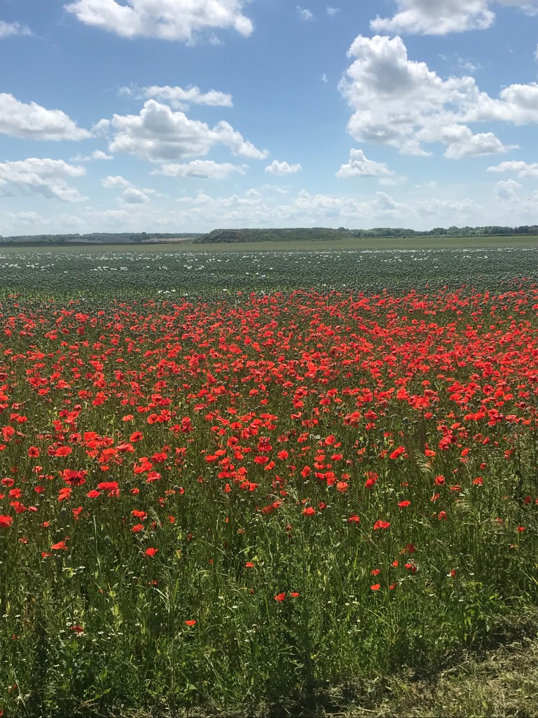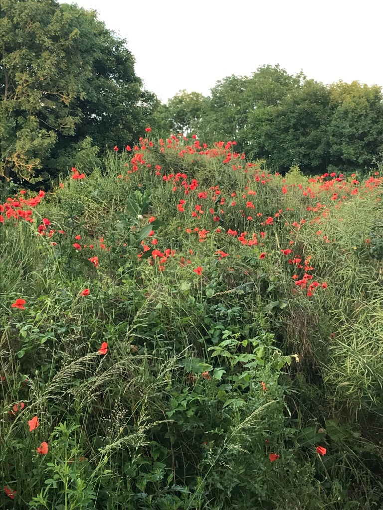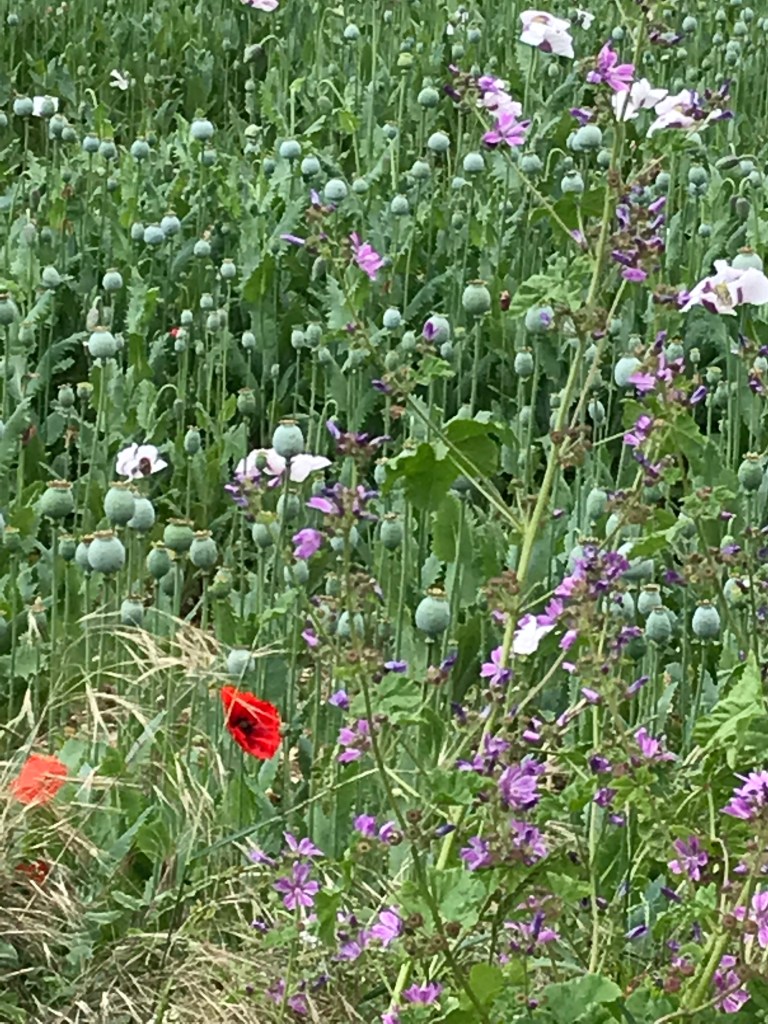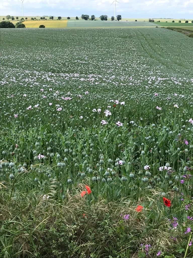 La champagne encore et toujours. Ses cultures immenses qui s’étalent jusqu’à l’horizon, pas un brin ne dépasse, des plants uniformes, rangés, dosés, inertes, droits et figés, calibrés jusque dans leur croissance synchrone, identiques comme des clones, monochromes, gemellaires par millions. Les petits chemins macadamisés qui s’aventurent dans ces mers végétales, sont, à cette époque, pareils à des tranchées, parcourues par des monstres hauts comme des maisons, grondants et crapahutant leurs tentacules et cahotant leurs mécaniques, affairés et indifférents. Sont-ils encore agriculteurs, ces pilotes du futur cachés à trois mètres de hauteur dans leurs cabines en verre teint ? D’ailleurs, sont ils les pilotes ou sont ils les esclaves de ces monstres ? Certains sont tellement hauts et ont les jambes tellement écartées que je pourrais passer dessous. Je les entends se rapprocher derrière moi et je me fais tout petit; c’est sûr l’un d’entre eux finira par me dévorer tant il est évident que je n’ai rien à faire à trainer dans ce monde de technologie aseptisée et de fureur productiviste, avec mon vélocipède modeste et silencieux, à pulsion musculaire (j’insiste, il y a certes une assistance, mais il ne pédale jamais à ma place). La nature, la vraie, pas ces plants-soldats, est rejetée sur le bord des champs, où elle s’arcboute sur les fils étroits de terre non cultivée, anarchique, diverse, colorée et vivante. La nature n’est pas rancunière, elle continue malgré tous les assauts de l’homme à vivre le cycle des saisons et a faire péter les couleurs au début de l’été. Je ne me rappelle pas avoir vu autant de fleurs mais j’ai oublié certainement, parce que je vis en ville, coupé du monde vivant. Dans ces bouquets sauvages, inattendus, surprenants et généreux, je distingue des marguerites, des chicorées sauvages, des pissenlits, de rares bleuets, des boutons d’or, de la camomille sauvage et beaucoup, beaucoup de coquelicots. Il y a en partout, je veux dire qu’il n’y en beaucoup là où la terre n’est pas étouffée par le macadam ou la culture. Cette petite plante échevelée et têtue contre laquelle l’homme mène un dur combat de territoire, continue envers et contre lui, à balancer ses frêles pétales au rouge éclatant, au gré des caresses des vents. Extraordinairement résistante, ses graines peuvent rester dans le sol pendant plusieurs années avant de germer. Il n’est donc pas étonnant qu’il apparaissait en masse sur les champs de bataille dont la terre avait été remuée par les obus. Les combattants y ont vu le symbole du sang de leurs compagnons épandus sur ces terres amères. Décidément, le chemin ne s’écarte jamais beaucoup du souvenir de la grande guerre. De çi de là, sur de plus petites étendues, des champs de pavots (papaverum somniferum) pour l’industrie pharmaceutique. Le coquelicot se marie admirablement avec cette plante toute aussi échevelée, au feuillage vert argenté et aux fleurs blanches.