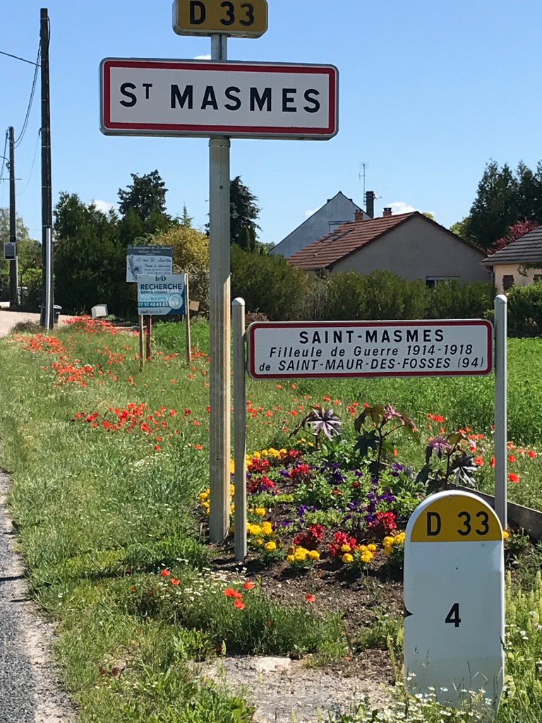 En arrivant à St Masmes, un panneau indique Filleule de Guerre 1914-1918 de Saint Maur des Fossés (94). La guerre toujours. Les communes qui n’étaient pas touchées par la guerre avaient adopté des communes meurtries pour leur envoyer de l’argent, des vêtements ou de la nourriture. Le mouvement se développera même à l’international. Saint Masmes, petit village de champagne a donc été adoptée par Saint Maur des Fossés commune du Val de Marne (94), dans les environs de Paris, où il existe une avenue Saint Maur. A Saint Masmes, la rue principale porte le nom de Saint Maur. La guerre laisse des traces qui ne sont pas toutes tragiques.