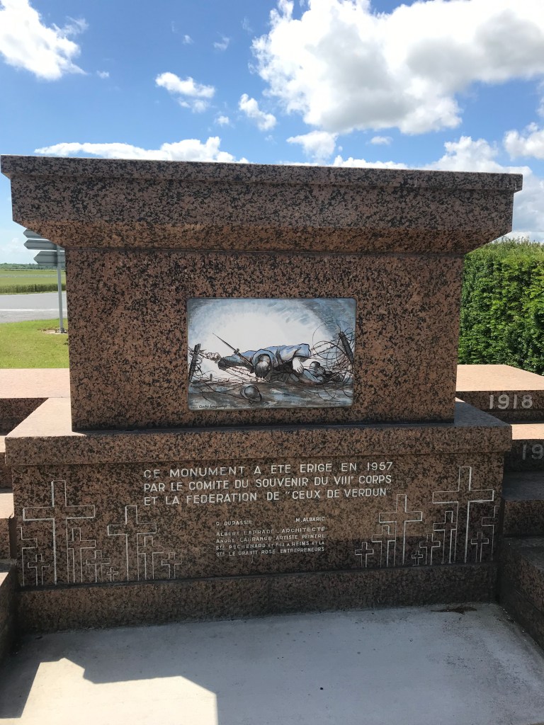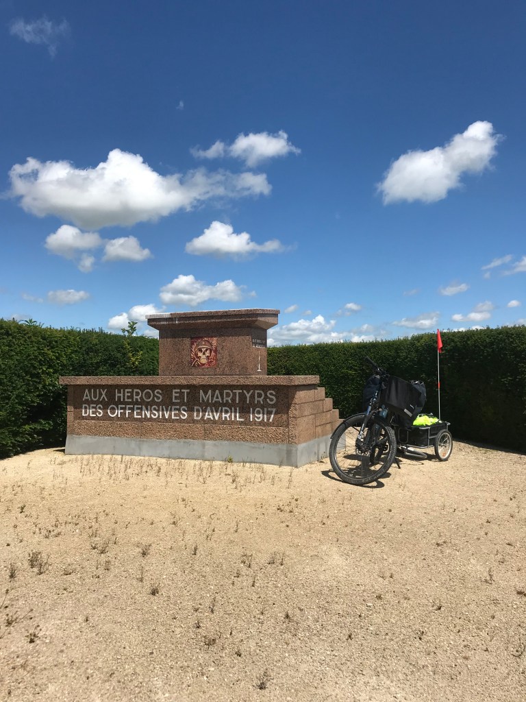 Plus loin sur ma route, un panneau Nauroy, village détruit attire mon attention. Je décide de me dérouter. Nauroy était situé sur une éminence dans la plaine de champagne. Elle était un poste d’observation dominant les environs (en Champagne une colline qui s’élève de 10 ou 20 m. est une colline dominante). Occupé par les allemands qui en avaient déplacés les habitant à Signy L’Abbaye, la position fit l’objet de combats acharnés en 1917. Précédé d’un pilonnage d’artillerie de 7 jours, l’infanterie a dû mener plusieurs charges, sortant des tranchées à 2 km du village pour prendre la position. On imagine ces hommes progressant, coupés en deux sous la mitraille, pour atteindre cette bute dans laquelle les allemands avaient creusé des galeries, où ils se terraient avec leur munitions. Après plusieurs tentatives avortées, on eut recours à l’aviation. Malgré plusieurs survols, les aéroplanes ne parvenaient pas à distinguer l’entrée des tunnels en raison des fumées des obus. Enfin, il fut possible de trouver une des trois entrées. On fit venir un canon puissant et de longue portée, installé sur voie ferrée de fortune et, guidé par les avions, plusieurs obus firent exploser l’abri allemand. Un médecin allemand a consigné dans un rapport écrit les événements qui ont conduit à la disparition de centaines de ses compagnons d’armes dans l’effondrement des galeries. A l’époque, on a rebouché les entrées faisant de ce lieu une nécropole allemande. Les corps seront par après enterrés dans le cimetière militaire de Warmeriville. Une association garde le souvenir de ces faits et le site web est assez touchant. Sur place, l’emplacement des maisons avec le nom des habitants est indiqué. Plus loin, un monument glaçant rappelle le sacrifice des soldats français.