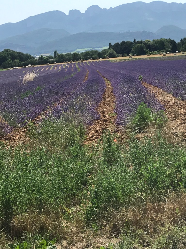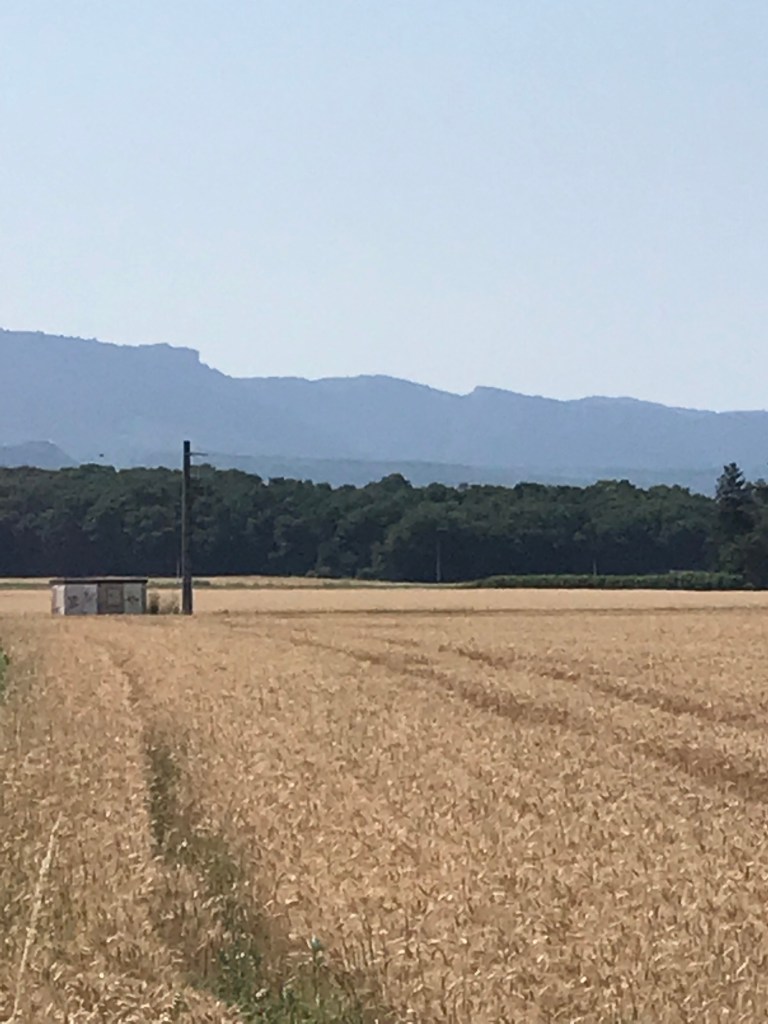 Je pars tard. Je n’ai aucune raison de me presser. La température a considérablement baissé. Je puis affronter les heures chaudes d’un été “normal”. Ma route longera toute la journée les massifs de la Chartreuse, du Vercors et du Diois. La barre rocheuse très nette à l’horizon, marque la frontière avec la Drôme des collines.