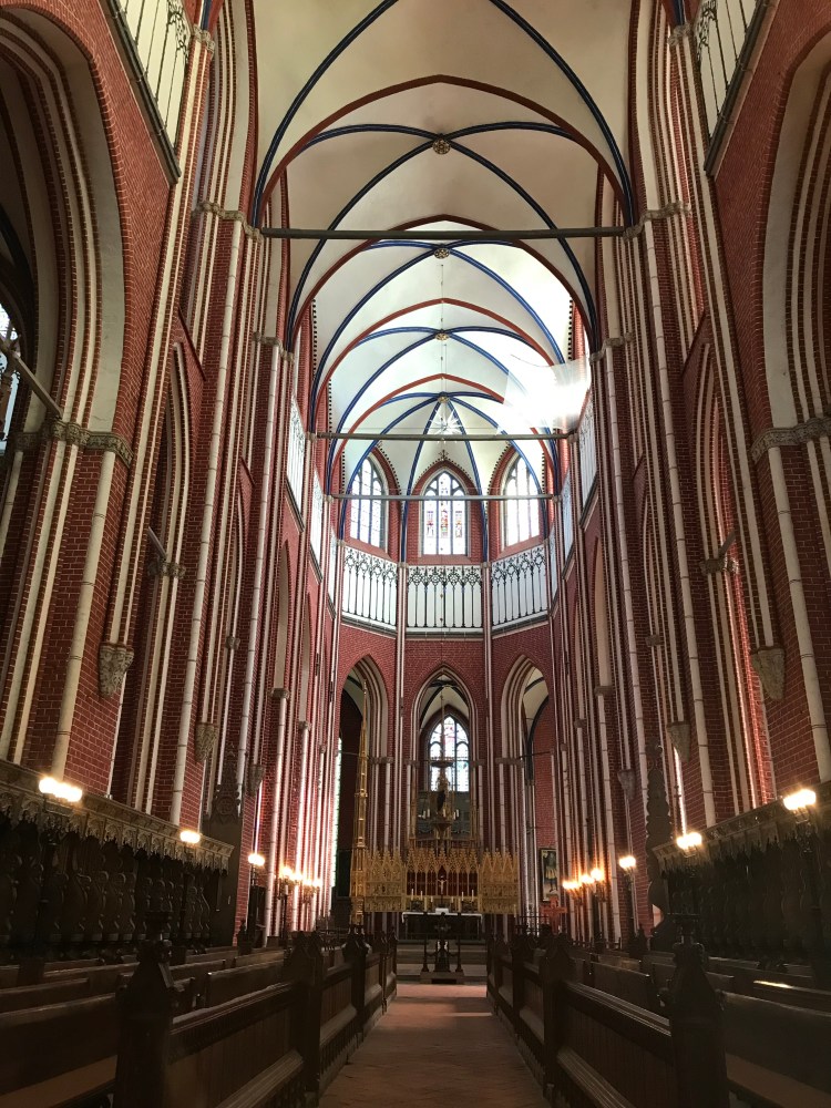 Nous repartons pour Bad Doberan où nous entendons siffler le train et visitons la décevante cathédrale en briques rouges (il y en aurait 5 millions), ancienne église du monastère cistercien dont les ruines importantes jouxtent la cathédrale.