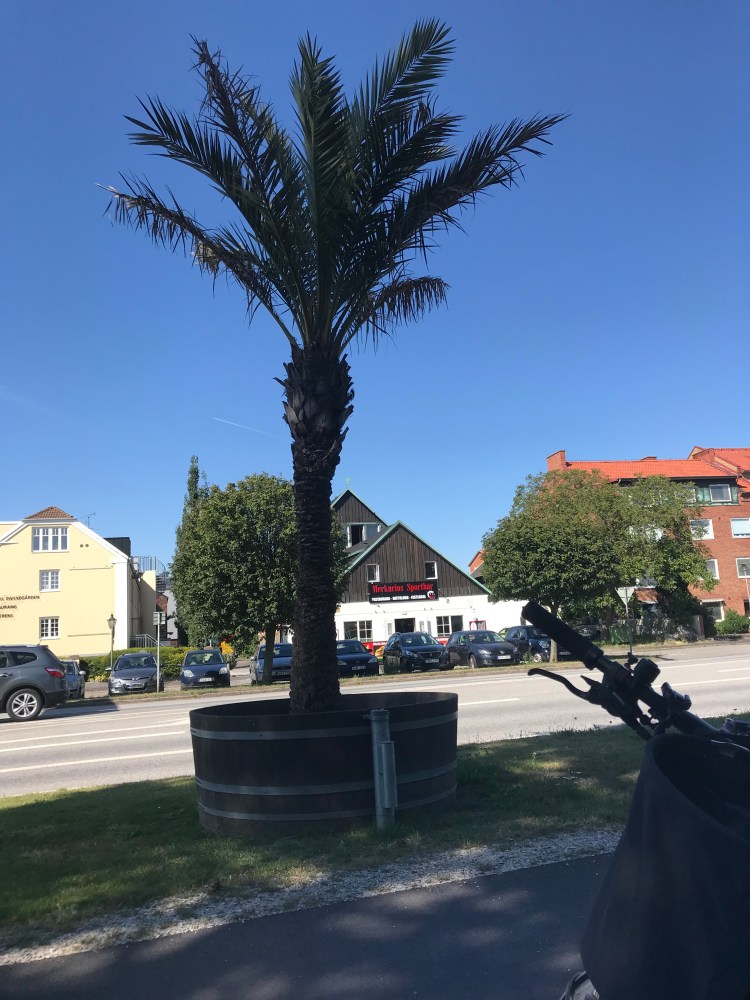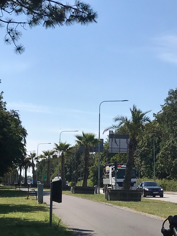 Nous y passons un bon moment mais il nous faut reprendre notre route et d’abord trouver un logement. Nous ne trouvons rien à un prix raisonnable si ce n’est une chambre à Skanör qui est à 70 km (à la louche) de l’endroit où nous trouvons. Nous en avons déjà fait 30. Cela n’effraie pas ma blonde décidément extrêmement courageuse à vélo. En route donc. Nous repassons par Trellenborg et son allée de palmiers qui paraissent très insolites dans ce coin du nord. Il est vrai que nous avons retrouvé le soleil et des températures plus clémentes qu’en Allemagne, 22/23 degrés; « le temps idéal pour faire du vélo » me dit Anne. Son enthousiasme me ravit mais je suis quand même un peu inquiet qu’en fin de course, cette belle humeur ne se transforme en amertume sous l’effet de la fatigue.