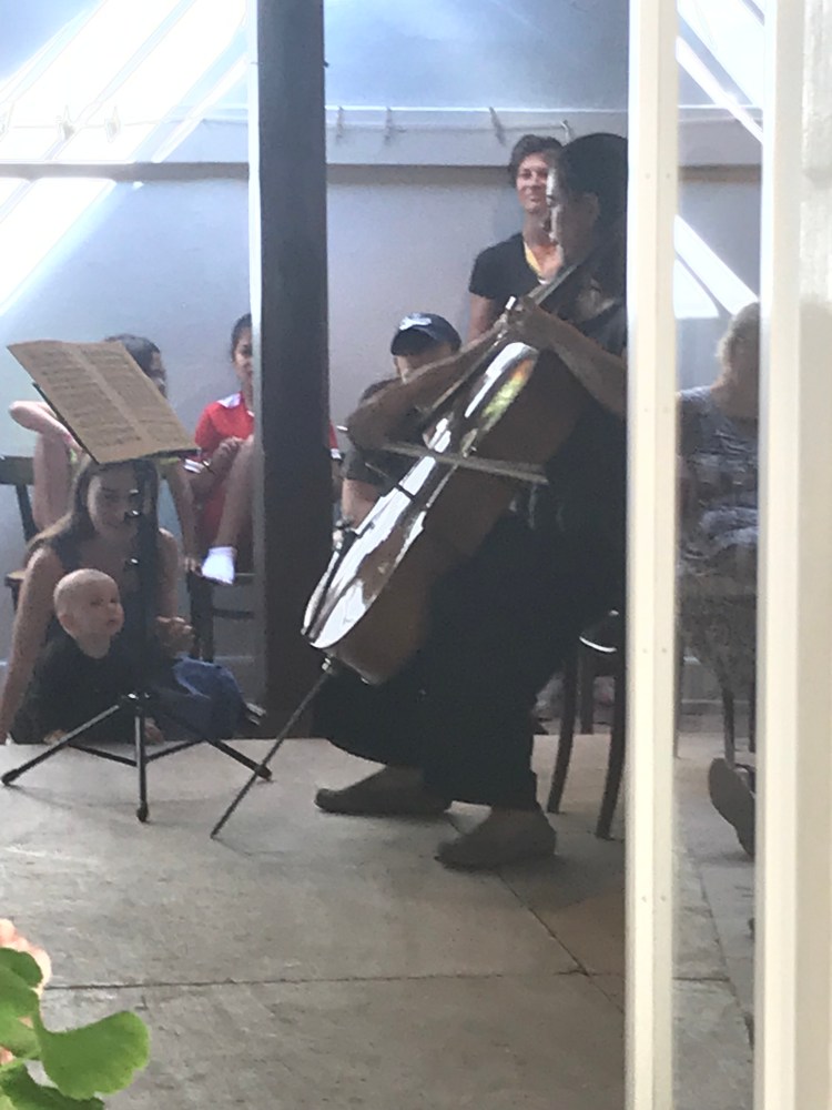 Et puis au détour d’une petite route dans les bois, une surprise : une vieille école où se déroule une fête. Les enfants sont attablés et dessinent pendant qu’un petit orchestre de chambre joue un trio de Mozart. Tout cela dans une ambiance très décontractée. Une violoncelliste (remarquable d’ailleurs) joue ensuite un morceau de musique contemporaine suivie par une suite de Bach. D’autres cyclistes de passage s’arrêtent. Un petit moment de légèreté musicale hors du temps; avant de reprendre la route au milieu des champs.