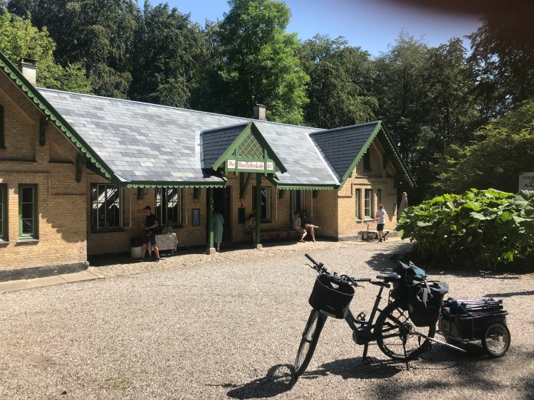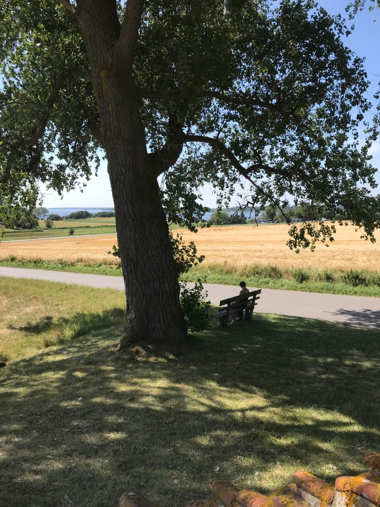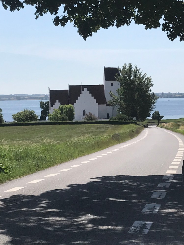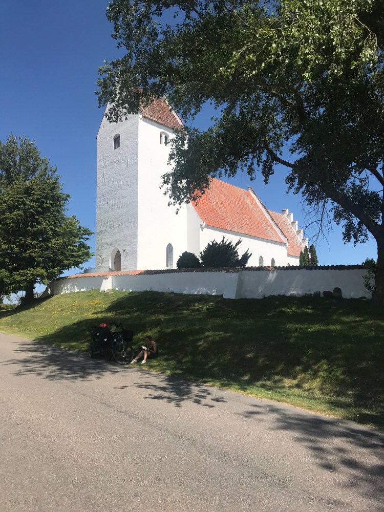 D’après internet et les applications que nous utilisons, il n’y a aucun logement disponible sur Mon. Les campings qui ont un site, affichent complet. Par précaution, nous avons quand même appelé un camping le matin, pour voir si des randonneurs à vélo pouvaient être acceptés. Réponse affirmative, “au besoin on fera bouger des voitures pour faire de la place”. Anne qui aime camper, se réjouit de cette perspective. Je suis résigné : il n’y a manifestement pas d’alternative. Nous consultons l’office du tourisme lorsque nous arrivons à Stege, la principale ville de l’île, peu après avoir franchi le pont. Une vieille lady qui s’efforce de parler français, nous remet une liste de camping et des cartes des pistes cyclables. Question logement nous ne sommes pas très avancés et mon appréhension grandit avec les kilomètres; nous faisons une petite pause en ville pour étudier la situation et Anne, décidément très détendue, en profite pour s’acheter une petite bague chez une femme, artisan orfèvre local.