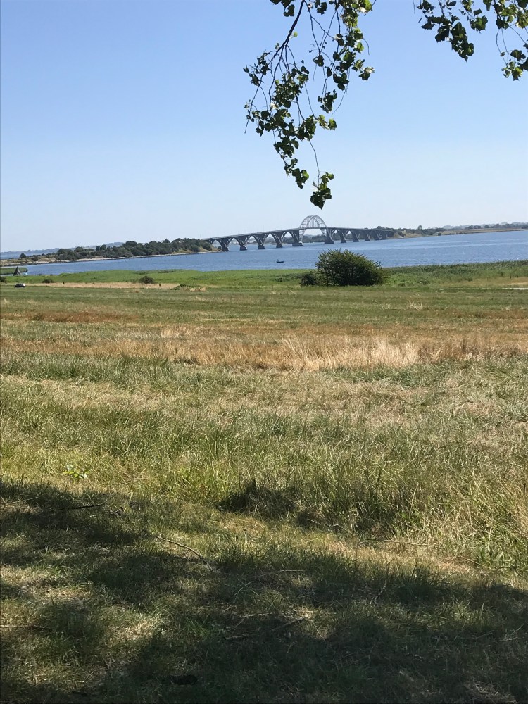 Nous approchons de Kalvehave où un pont permet de rejoindre l’île de Møn. Il se profile au loin. Franchir les ponts est parfois périlleux parce que la place réservée aux vélos est souvent (certains ponts sont anciens) très réduite et se croiser est difficile sinon impossible sans mettre pied à terre. Il faut naviguer et garder son équilibre entre balustrades en acier et séparation en béton.