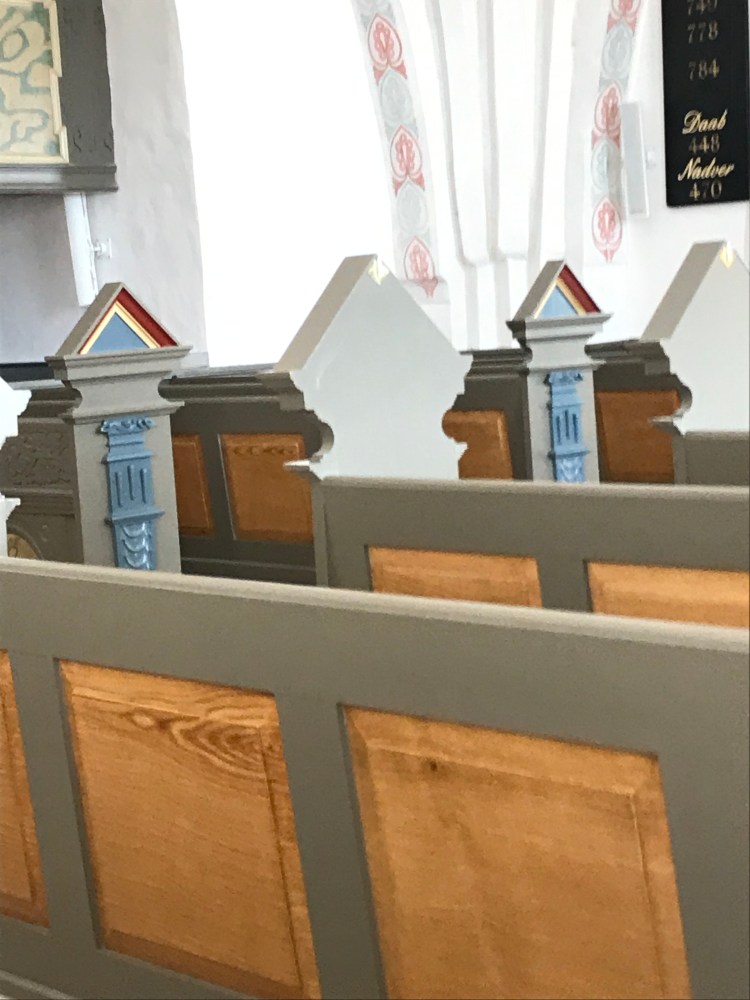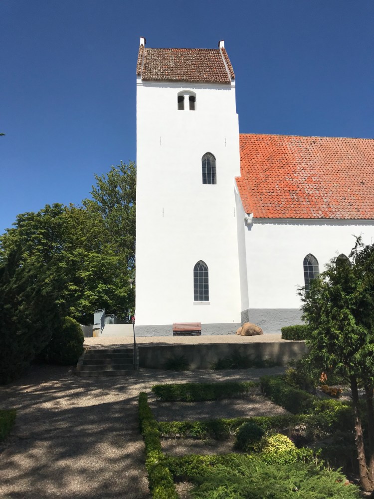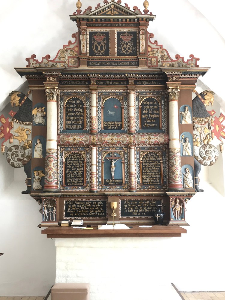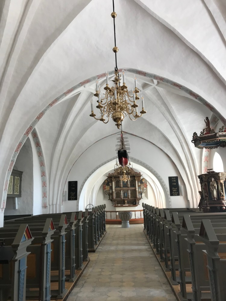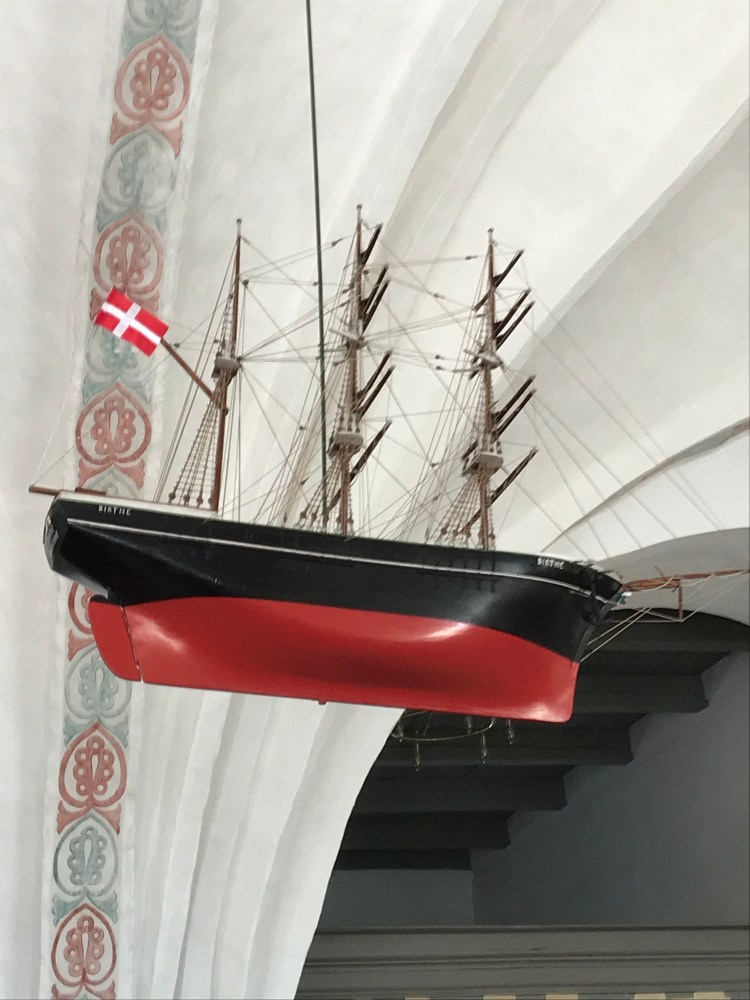 Mais avant de franchir le pont nous nous arrêtons auprès de la splendide église du 13ème siècle, bâtie à l’écart du village , sur une petite colline et entourée comme il se doit, d’un petit cimetière-jardin. Comme dans beaucoup d’église que nous visitons, une maquette de navire pend au milieu de la nef centrale. C’est un bateau votif. Comme l’explique Wikipedia, Ces navires votifs sont des offrandes propitiatoires, parfois faites avant d’entreprendre une expédition maritime, mais sans lien avec une épreuve, un danger ou une fortune de mer précise. Ils sont offerts par les communautés de marins pour se placer sous la protection divine. Ce type de maquettes, souvent de facture très fidèle à l’original, est suspendu de façon bien visible au centre de la nef de l’église. Ces ex-voto sont particulièrement nombreux dans les églises des pays scandinaves.