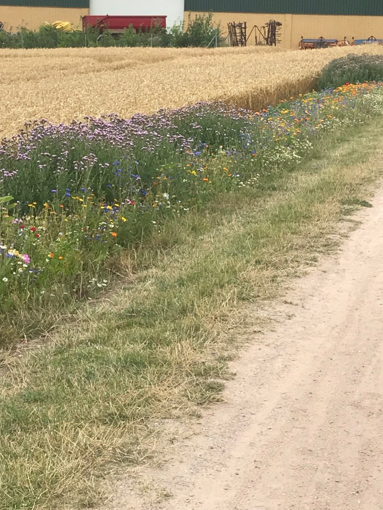 Nous quittons notre repaire en bois assez tôt et nous nous mettons en route le long des plages de la Baltique. L’île de Fehmarn héberge un tourisme de masse et les campings se succèdent le long de la côte. Le vent s’est un peu calmé mais restera présent néanmoins tout au long de la journée. Nous longeons des champs et comme au Danemark ou en Suède, certains champs sont bordés de bandes de fleurs sauvages, manifestement semées, pour conserver un biotope pour les abeilles et autres insectes butinant.