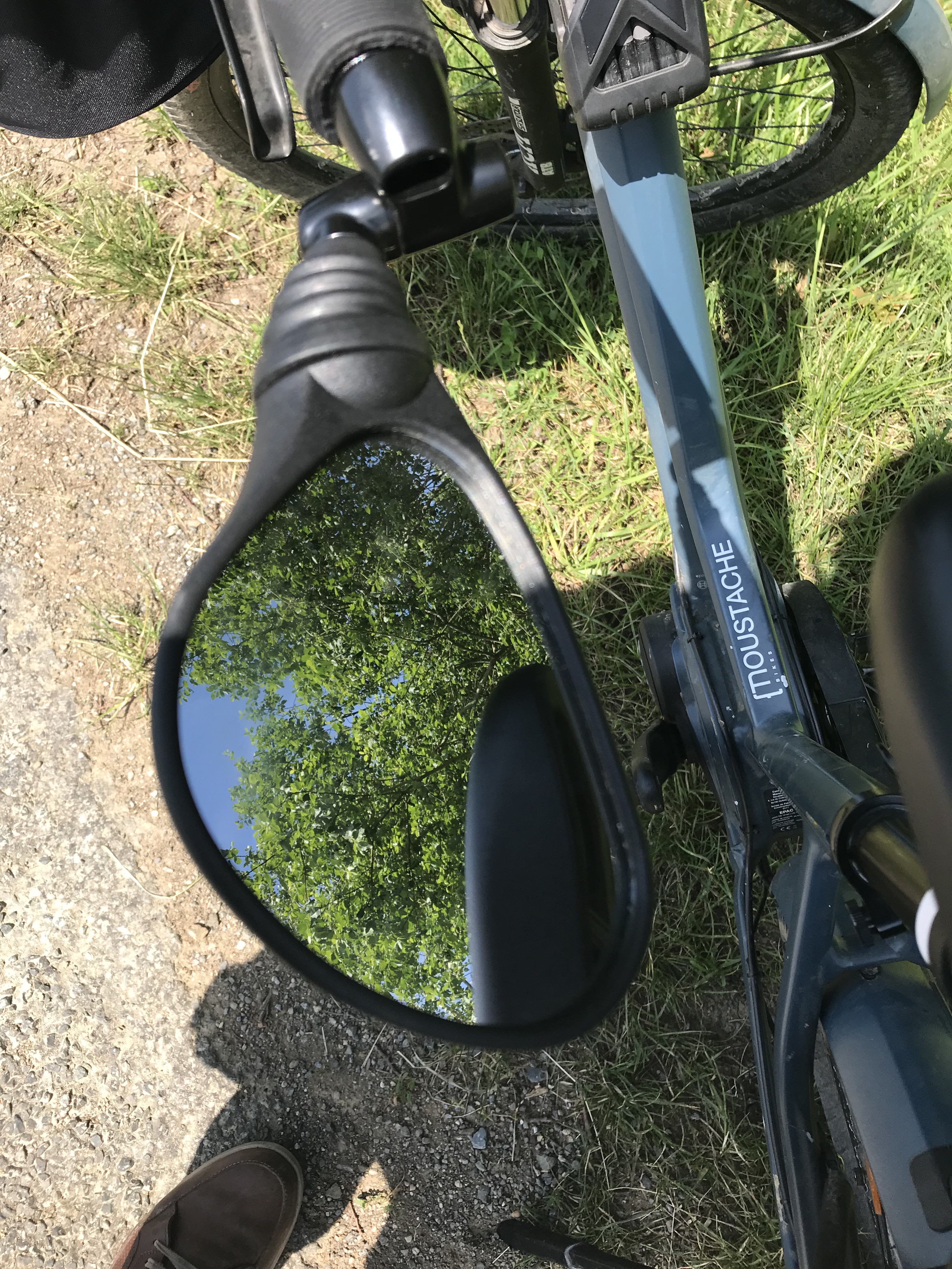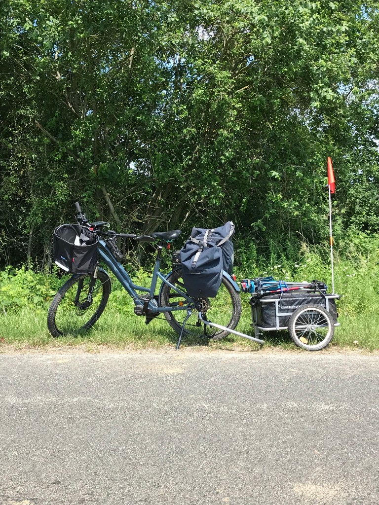 Parlons matériel. Je voyage sur un vélo Moustache . Ils sont fabriqués en France dans les Vosges. J’utilise un vélo Saturday 2.0. Ce vélo est très robuste avec un cadre ouvert ce qui permet de l’enfourcher sans devoir jeter la jambe par-dessus la selle. Un avantage lorsque l’âge avance… La fourche avant est équipée d’amortisseurs Suntour NEXE25 qui protègent les bras des chocs dans le guidon. Le porte-bagage est équipé d’un système de fixation qui permet d’attacher les fontes Ortlieb de manière très sure en un clic et de les détacher de la même manière. Il est également équipé d’un moteur Bosch 500 watts et d’un boitier de commande Purion qui permet de choisir l’assistance électrique (4 niveaux), de connaître les Km parcourus pour un trajet, la totalité des km parcourus par le vélo et les Km que la batterie permet encore avec l’assistance. Le moteur est puissant et son utilisation très fonctionnelle. Il est bridé à 25 Km/h. J’ai choisi un guidon horizontal plutôt qu’un guidon très cintré (qui est caractéristique des vélos moustache). Cela m’a permis d’ajouter un panier ouvert à l’avant avec le système très pratique KLICKfix. C’est très utile pour les randos : on peut avoir à portée de main, cartes, portefeuille, clés, bouteille d’eau, GSM, casse-croûte, sans devoir ouvrir et fermer des sacs. Ce vélo pèse 23,4 Kg avec sa batterie. Au total, avec son moteur électrique, son moteur humain et les fontes et la remorque et son contenu (dont un ordinateur), il faut faire avancer environ 150kg. Je ne me suis pas restreint en poids pour ce voyage et je tire donc une remorque avec tout le matériel pour camper notamment. Comme je n’ai pas programmé toutes les étapes, vu le poids et mon absence d’entrainement, je me suis équipé d’une batterie supplémentaire (500W+400W). La selle est très confortable (selle Royal Wave ergonomique à tige). Last but not least, j’utilise beaucoup le rétroviseur installé dans le prolongement du guidon: je peux anticiper l’arrivée des camions, rouler au milieu de la route quand il n’y a personne et surtout ne pas regarder derrière moi au risque de perdre l’équilibre.